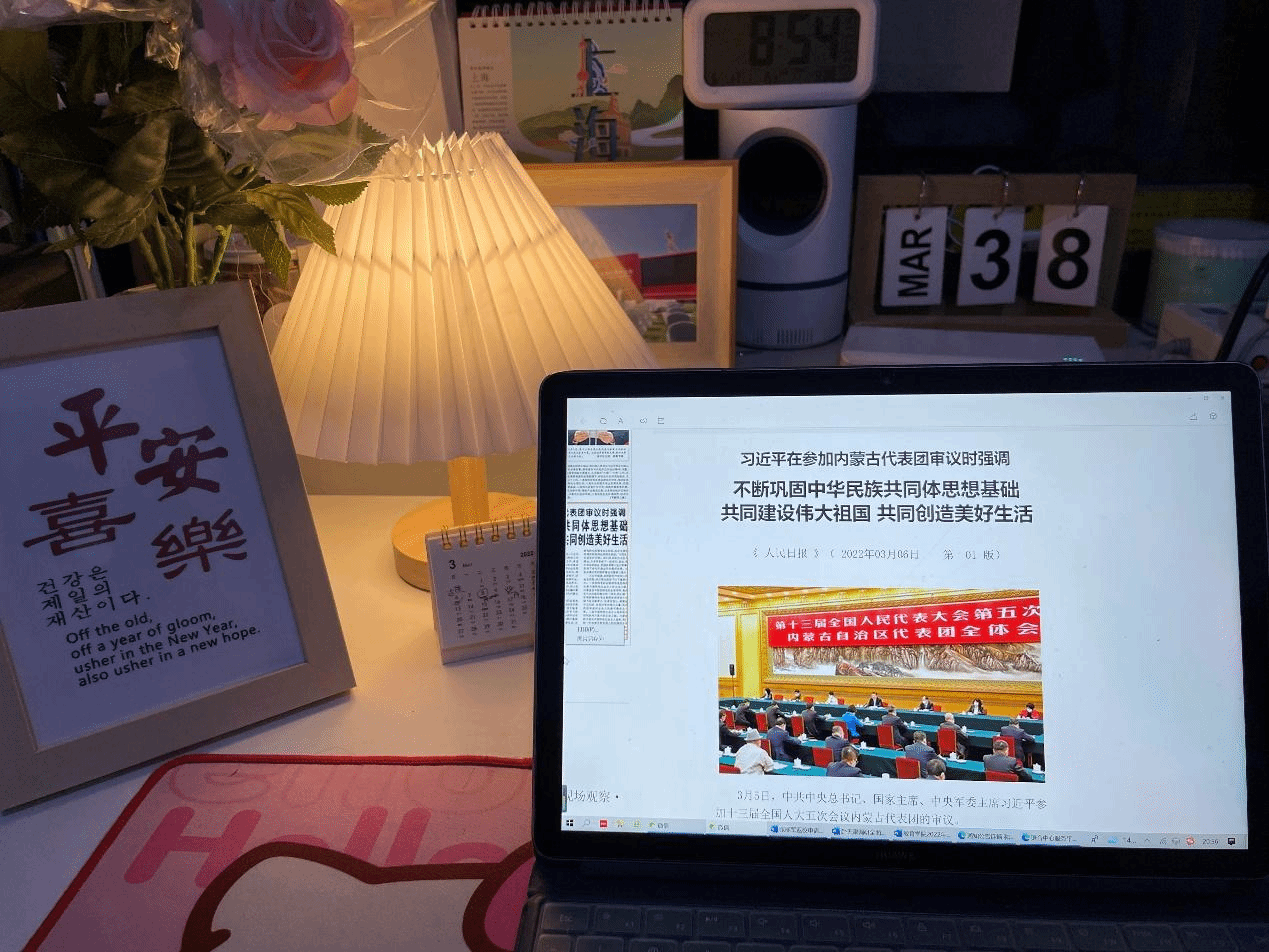 突发反复的疫情,阻断了大家的归校之路,实属遗憾!但“停课不停学”的线上授课,弥补了大家渴求知识的内心缺憾!线上的教学虽然无法让师生、生生面对面交流,但节省了大家的时间成本,为学习腾出更多自由的时间!在居家线上上课的这段时间,我并没有因为无法回到学习氛围浓厚的校园而有所懈怠,相反,我很快适应了在自己房间里静心学习的这种空间转变,也真真切切的体验了一把线上上课的感觉,加入了线上上学的大队伍!但同时也希望疫情能够早日稳定,期待回到民大,与老师、学生再次相见!