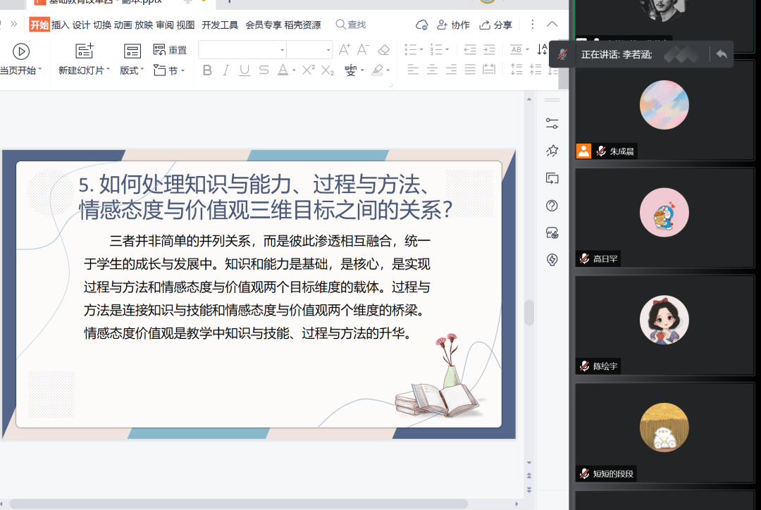 本学期《音乐教学设计与实施》课程因疫情原因暂时无法线下进行,转为在崔老师的带领下通过腾讯会议的形式进行学习。虽然疫情阻拦了我们见面,但阻拦不了同学们学习的热情,大家在课上各抒己见、积极讨论。崔老师认真负责地教导我们如何进行音乐教学的设计,并手把手地带领我们进行教学实施,每个字每句话都要斟酌考虑。尽管疫情还没有结束,但我相信在认真负责的老师带领下、热情友善的同学帮助下,无论课程以何种形式进行,我们都可以在此门课程中得到成长。