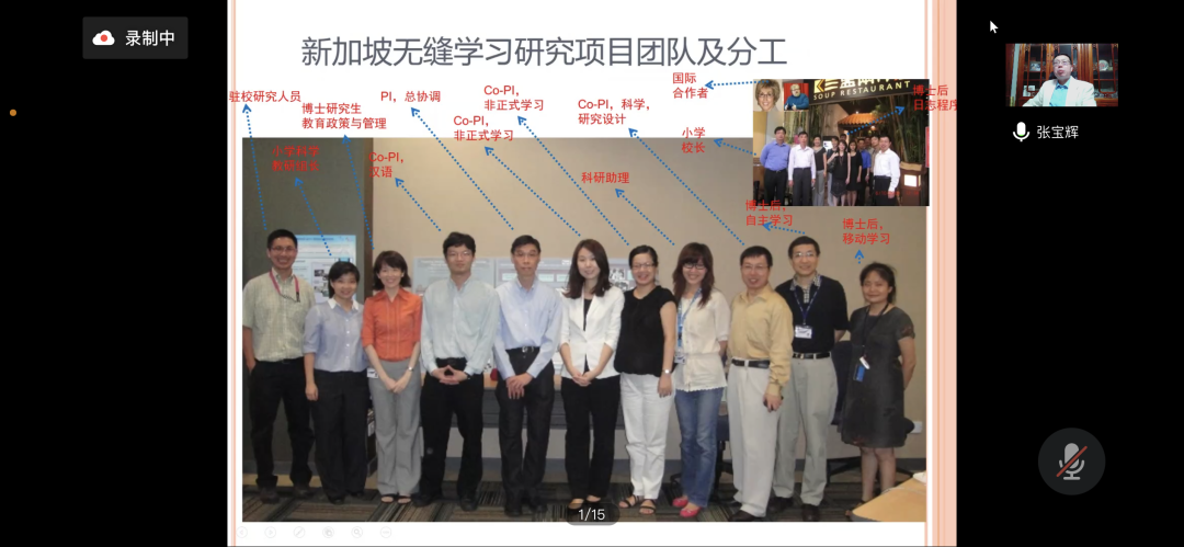 首先,他向大家展示了自己在新加坡与合作者进行的“无缝学习(SEAMLESS LEARNING)环境构建与应用”的相关研究,强调在无缝学习的环境里学生如何去掌握学习的方式,培养无缝学习的习惯,教师在课堂中如何去发展学生自主学习的能力,以及如何通过各种现代技术去支持学生的学习。