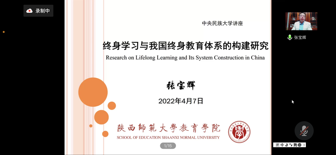 自20世纪60年代中期以来,在联合国教科文组织、经济合作与发展组织及其他相关国际机构与组织的大力提倡、推广和普及下,终身学习作为一个重要的教育理念已经在世界范围内广泛传播开来。如今,许多国家在制定教育方针政策或是构建国民教育体系框架时,均会以终身教育提出的各项基本原则为基点,并以实现这些原则为主要目标进行推进。为了促进全院师生对“终身学习”、“终身教育”的理念有更为深入和全面的认识,并由此发展自身终身学习的能力,william威廉中文官网教育学院邀请了陕西师范大学教育学院原院长张宝辉教授开展题为“终身学习与我国终身教育体系的构建研究”的学术讲座。讲座由教育学院苏德教授主持,周廷勇、江凤娟等老师和学生共110余人在线聆听了讲座。