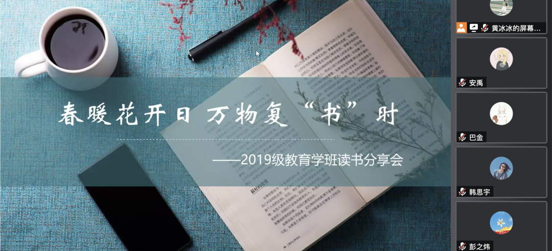 值此第27个世界读书日到来之际,为激发我院学生的读书热情,提高大学生的综合素质,营造积极向上、清新高雅的文化氛围,使我院学生能够“宅”享文化盛宴,有效丰富精神文化生活,2022年4月21日晚19时30分,19级教育学班通过腾讯会议召开春日云端读书会,来自五湖四海的39名同学齐聚云端,倾心交流,以书会友,畅所欲言,共同探讨读书的想法和思考。19级教育学班班主任周廷勇老师和辅导员王小婉老师出席本次读书会,读书会由班长黄冰冰同学主持。