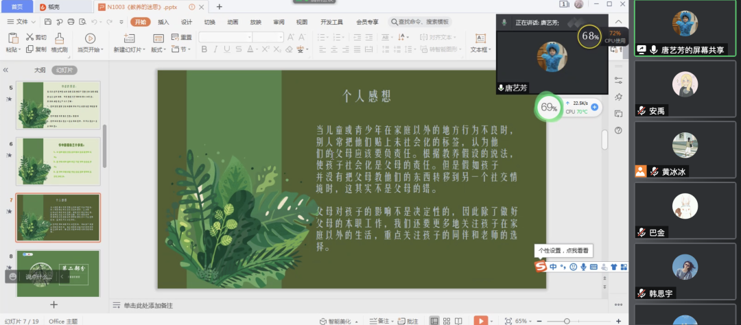 紧接着,第四组的唐艺芳同学分享的书目是朱蒂·哈里斯的《教养的迷思》一书。该书改变了我们“过去性格是受父母所塑造的影响”这一固有观点,并且为我们提供了一个新的看法——“孩子的人格可能被什么所塑造”。同时,通过本组成员们的分享介绍,我们还学习到了很多富有理论价值和实践意义的教育观点,为我们开启了教育思想新世界的大门。