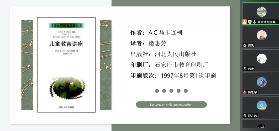 在班级读书小组的阅读分享环节中,首先,第一组的黄冰冰同学为大家分享了《儿童教育讲座》一书,她从多个方面为同学们介绍了马卡连柯所提倡的家庭教育,让我们感悟到家庭教育的重要性。黄冰冰同学特别提出其中的集体主义、劳动教育等教育思想对于我们当今社会仍具有极大的启迪意义,值得我们深入学习与思考。