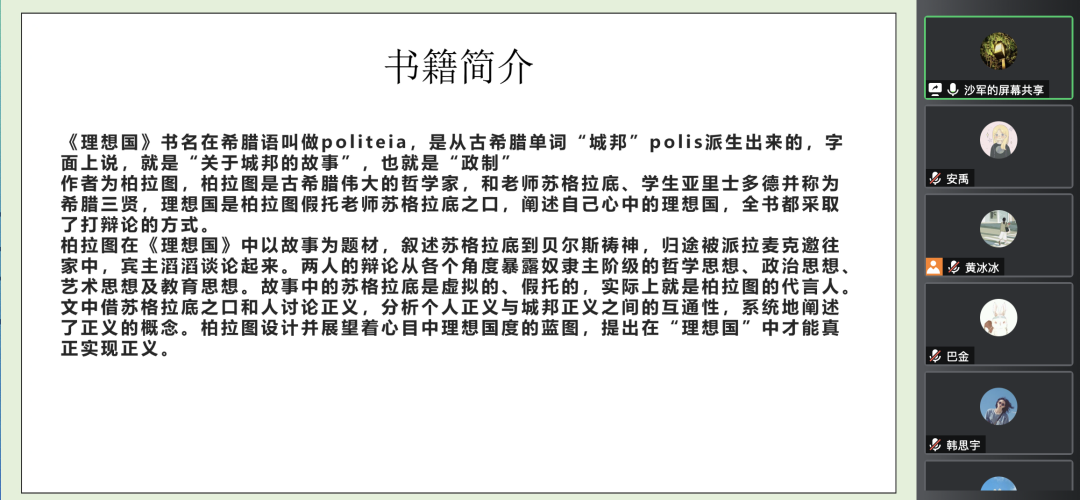 最后,第五组的沙军同学向大家介绍的是教育学中三大里程碑式著作之一的《理想国》。在大三这个重要阶段再次阅读与分享此书,我们明显已有了更为深刻的思考,这也正是好书常看常新的价值所在。其中,他提到的“正义就是城邦和灵魂中各个组成部分的和谐”让同学们印象深刻,大家的思绪也随之飞向了柏拉图的理想国度中。