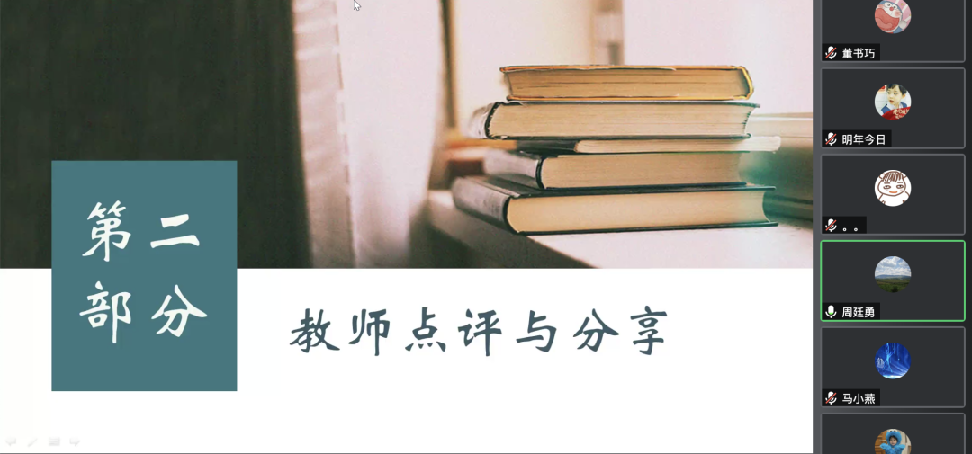 其次,周廷勇老师也对于本次各组汇报的内容进行了高度评价。他指出,各个组都能够从实际出发,分享所感所悟,而且在大家的分享中能够看到大家作为教育学人对教育学知识的深切领悟,同学们的教育智慧、教育情怀、教育热情令人鼓舞。每个组不仅有小组的集体思考与感悟,更有个人的分享与心得,可以说是精彩纷呈,这对同学们来说是非常宝贵的体验与收获。尤其是云端读书会的形式,打破时空的阻隔,小组合作共读一本书,碰撞彼此思维的火花,更是难得的经历,未来可以继续延续并创新这一形式。最后,周廷勇老师也结合自己的亲身感悟,向全体同学提出了关于未来读书的真切期望并与全体同学共勉:“希望同学们继续坚持读书的好习惯,好读书,读好书,认识到读书的好处!让阅读成为一生的习惯,做一个终身学习的践行者!”