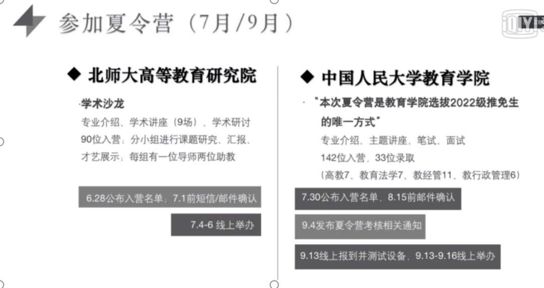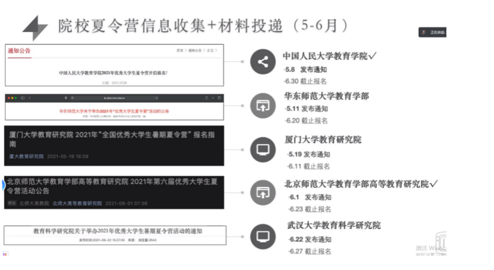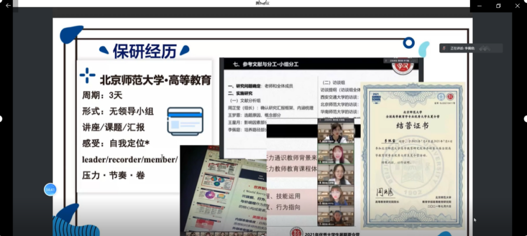 葛书含分享了自己参加北师大高等教育研究院和中国人民大学教育学院夏令营的经历,与同学们分享了三点经验。第一是要提前准备好中英文自我介绍;第二是要熟知教育学的基础知识和时事热点问题,提早准备英文问题;第三是由于老师所问的问题涉猎的范围都很广,所以要尽可能地拓宽自己的知识面。