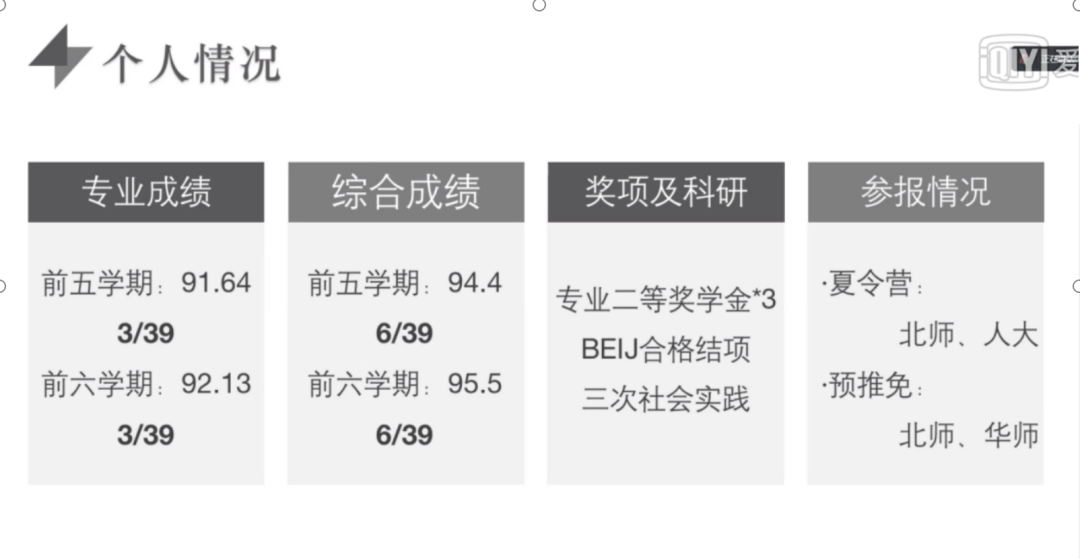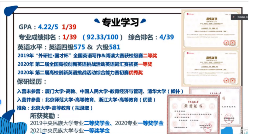 首先,三位嘉宾依次对自己的综合成绩、获奖情况、科研经历、保研经历、最终保研去向等情况做了介绍,并特别强调,在时间允许的情况下要多参加各种校内外的活动,丰富见识的同时提升综合实力,这样在择校时会更具竞争力。
