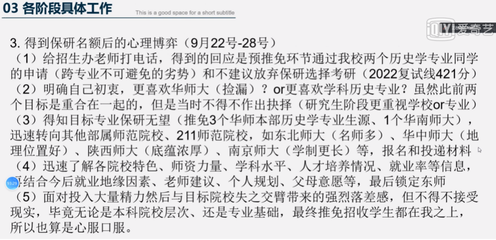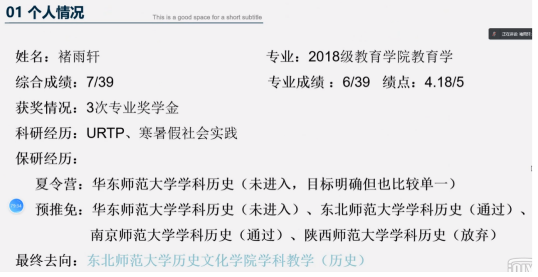 褚雨轩介绍了自己保研过程的时间线,并分享了自己从对保研不报希望到最后逆风翻盘成功上岸东北师范大学的心路历程,鼓励同学们即使是在未知的情况下,也要付出百分百的努力,坚定一往无前的决心。