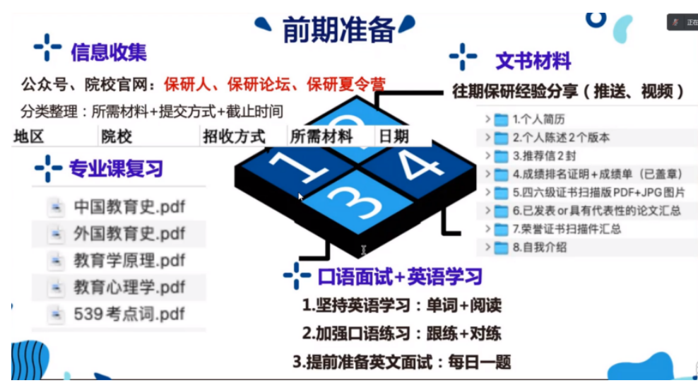 随后,三位嘉宾向参会的同学们介绍了自己的保研历程,并总结了在保研过程中遇到的问题以及各个院校在夏令营、预推免环节的招生特点。