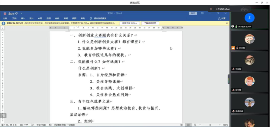 在会议中,翟老师分别从创新创业大赛与教院学生的关系,学生能在创新创业大赛上做什么、如何选题、什么是创新,以及青年红色筑梦之旅模块三个方面进行了讲解,介绍了创新创业大赛的基本知识以及学生能够参与的比赛类别,其中还突出了对新文科类项目的介绍,为教育学院的同学提供了更多的选择空间,并对学生参加大创比赛的方式和注意事项做出了详细的指导。