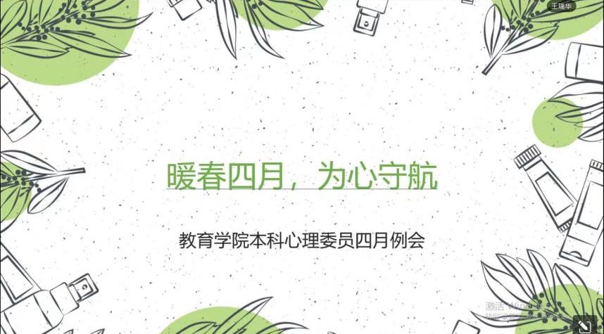 王小婉老师首先表达了对充分筹备本次心理委员例会的心理部工作人员和积极参加本次会议的心理委员们的赞扬和肯定,并鼓励心理部成员及各班级心理委员关注公众号“高校心理委员工作平台”,认真学习与汲取公众号提供的各类心理知识,并将其运用到班级心理工作实践中,主动发挥作用,充分利用心理班会、心理活动等形式,增强居家期间同学们之间的交流联结。