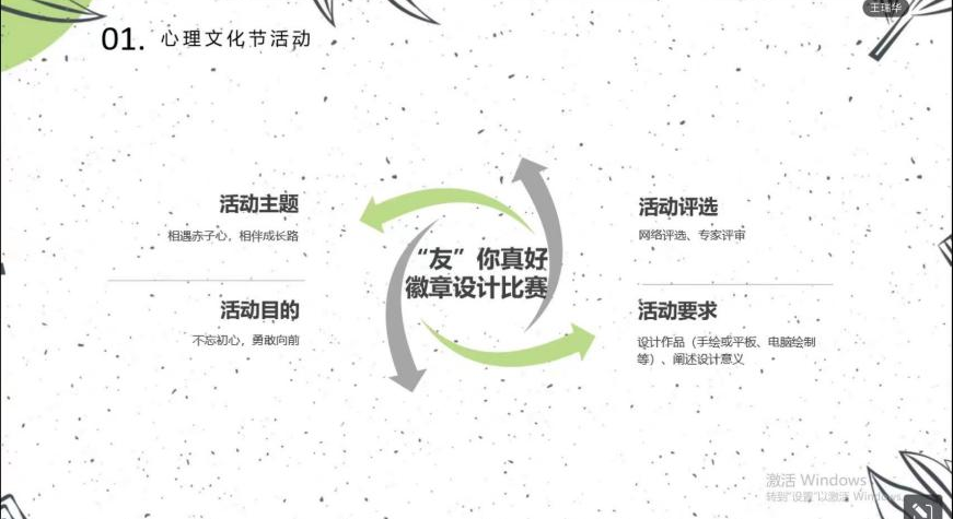 随后,进入会议第一项“回望四月”。主持人带领大家回顾了四月心理文化节举办的活动,并就“友你真好”徽章设计比赛活动成果进行了总结,感谢并充分肯定了各班心理委员的支持和努力。