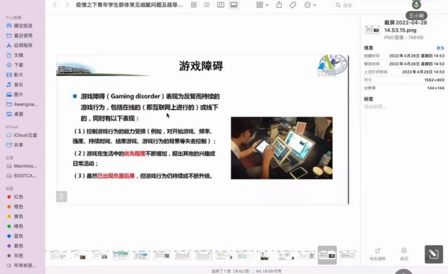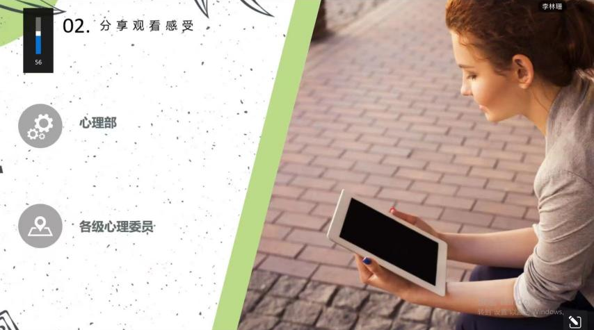 其次,王小婉老师分享了《疫情下青年群体常见心理问题及疏导干预策略讲座》的知识干货及她收看讲座后的感想,并着重强调了游戏障碍的相关内容,呼吁心理委员们在生活中要重点关注出现此类问题的同学,及时对其进行沟通开导。