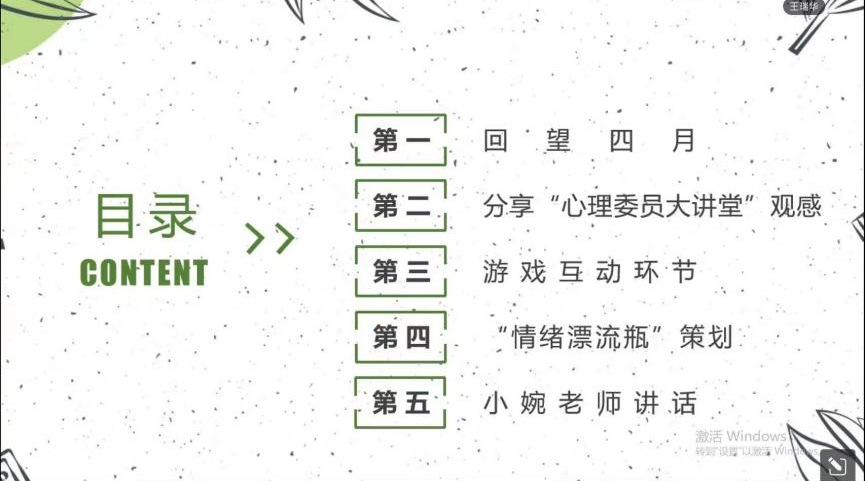 会议第四项环节,主持人对五月计划举办的“情绪漂流瓶”活动进行了说明与规划,帮助心理委员们提前了解下月工作安排,以便更好地配合心理部工作。
