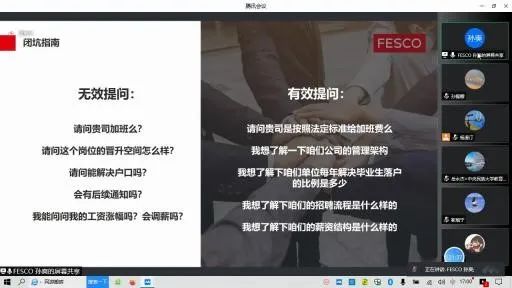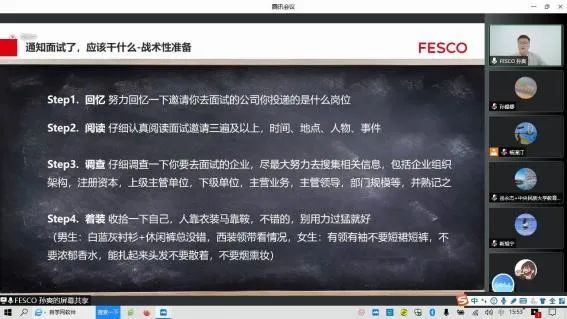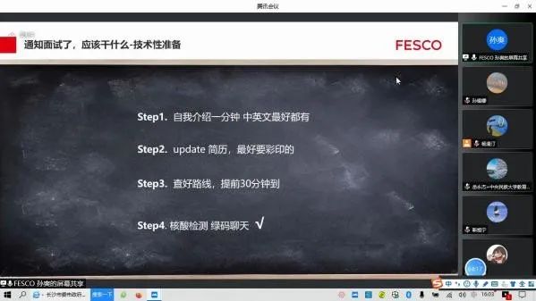 讲座正式开始前,孙爽经理先对北京外企人力资源服务有限公司(FESCO)和自身工作经历做了一个简单的介绍。讲座中,孙爽经理分别从就业准备、简历的准备、面试的准备、面试的类型、行话切口与避坑指南五个部分进行了讲解。