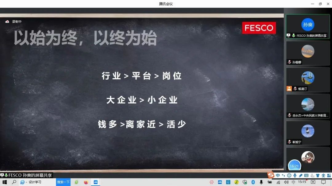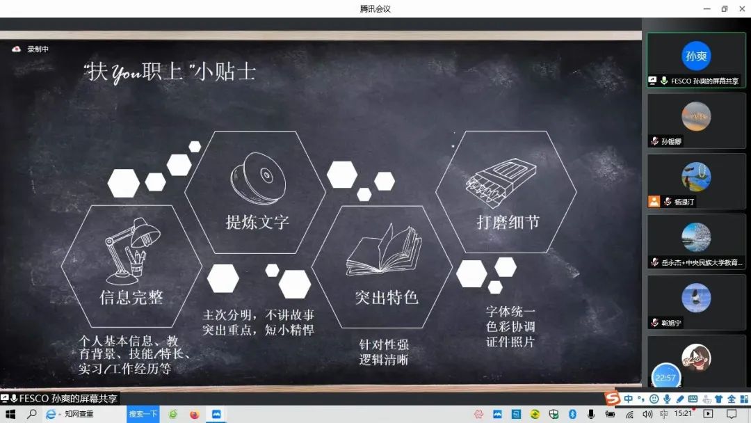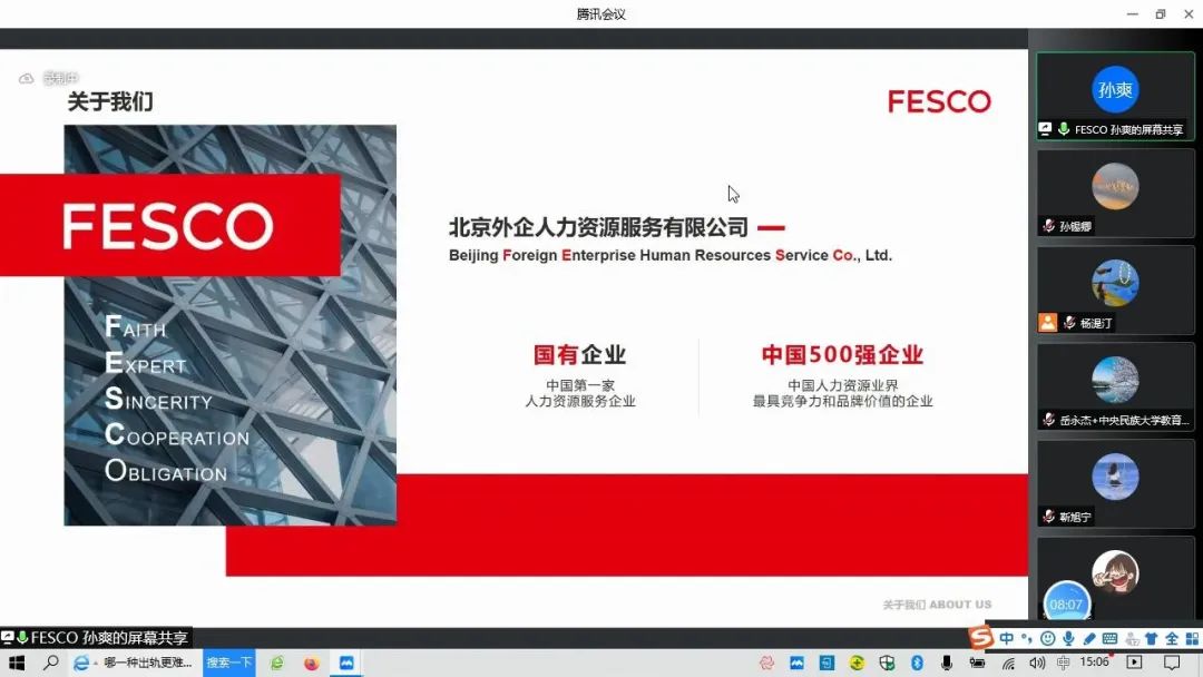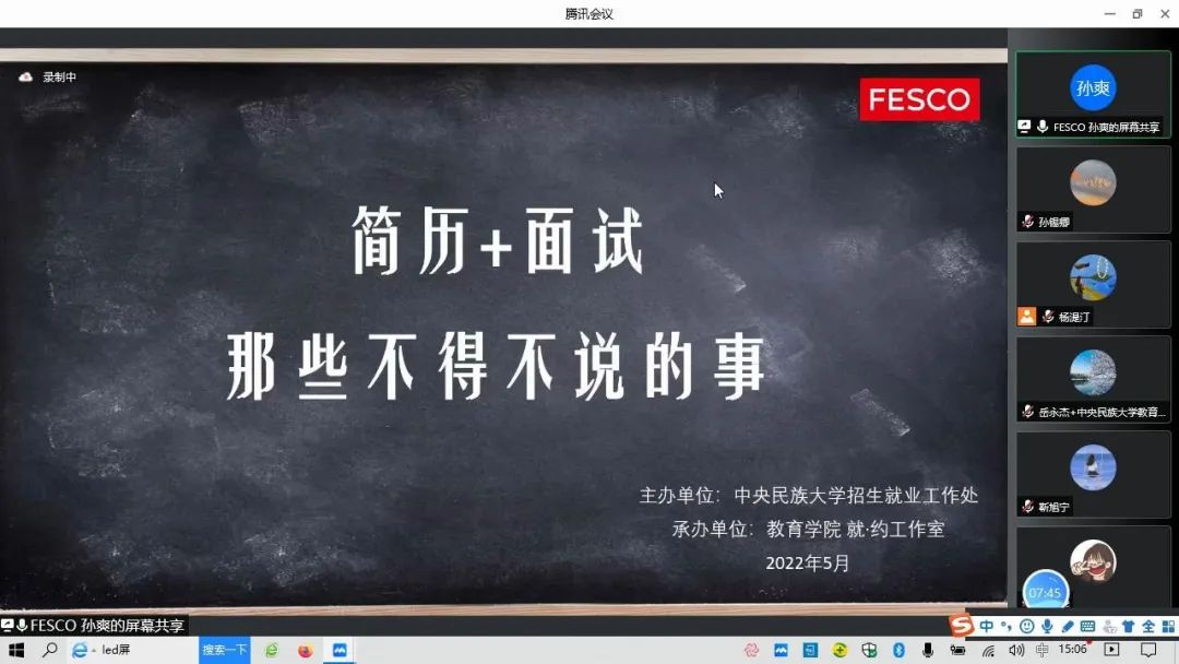 2022年5月6日下午15:00,由william威廉中文官网招生就业工作处主办,william威廉中文官网教育学院、“就·约”工作室共同承办,北京外企人力资源服务有限公司“扶You职上”项目经理孙爽主讲的《简历和面试不得不说的那些事儿》讲座以线上腾讯会议的形式顺利举办。招生就业工作处安丹丹老师、教育学院党委书记闫建敏老师、党委副书记岳永杰老师、团委书记王小婉老师、辅导员杨湜汀老师以及一百余名同学参加了此次讲座。本次讲座由教育学院党委副书记岳永杰老师主持。