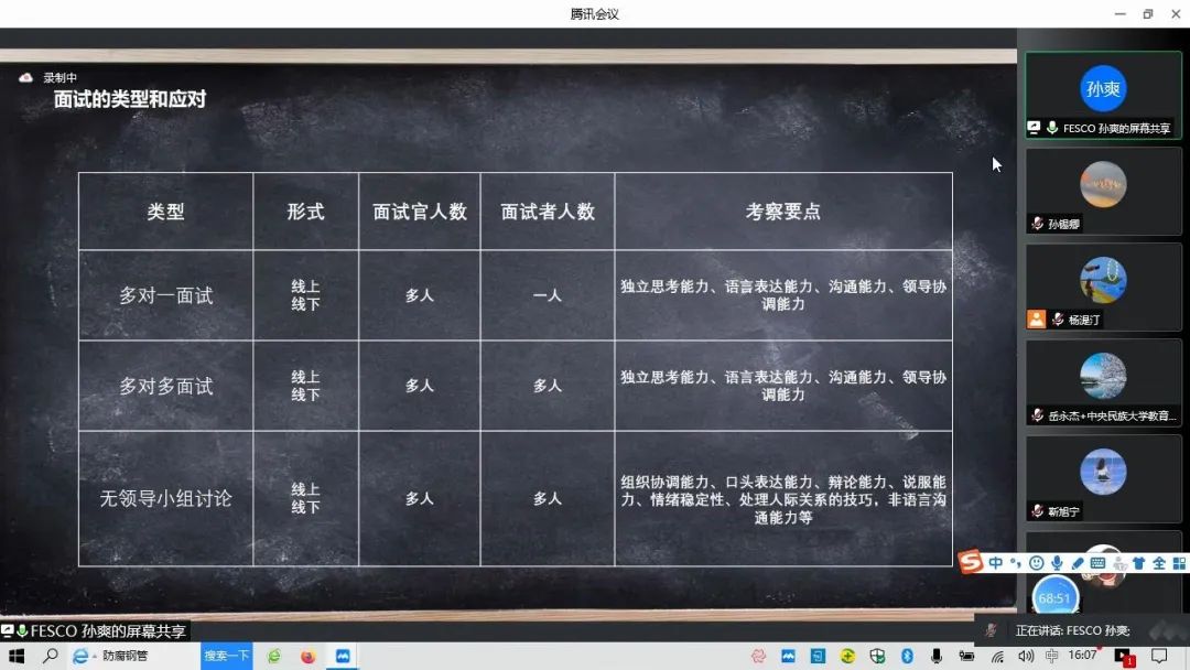 在“面试的类型”部分,孙爽经理首先介绍了多对一面试、多对多面试、无领导小组讨论三种面试类型的考察要点和从投简历到入职的整个流程。然后,孙爽经理就面试过程中的自我介绍、结构化面试、压力面试等环节的应对给出了自己的建议。最后,孙爽经理详细介绍了无领导小组讨论面试中的考察重点、注意事项以及得分点。