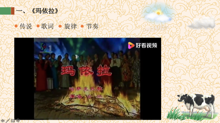 第一首是活泼欢快《玛依拉》,有关这首歌曲有一个传说:相传在俄国十月革命时,一位名为玛依拉的少女在新疆谢米卖马奶,她活泼可爱、歌声嘹亮,许多人为听她一展歌喉都纷纷来买她的马奶;我们聆听到的版本是经由我国著名作曲家王洛宾老师进行改编的,全曲用三段歌词,把玛依拉姑娘的开朗、活泼的性格和美妙歌声表现得淋漓尽致;歌词的语言描绘也直白形象,可以很容易地让人们联想到美丽、开朗的玛依拉;这首歌曲采用的是七声音阶,即do、re、mi、fa、sol、la、si这七个音在乐曲中都有体现;