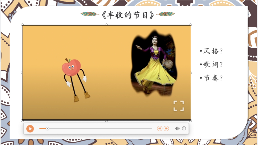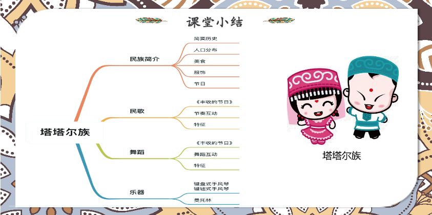 欣赏舞蹈《丰收的节日》后,我对其舞蹈特征进行总结:塔塔尔族舞蹈兼收并蓄了维吾尔族、俄罗斯族、乌兹别克族的舞蹈;舞蹈形式有独舞、对舞、男女可以同场共舞;男子多踢蹲、跳跃的脚部动作;女子多以手部、腰部动作为主;舞蹈多用手风琴和曼托林的乐器伴奏。由此,顺利衔接到第四个部分。
