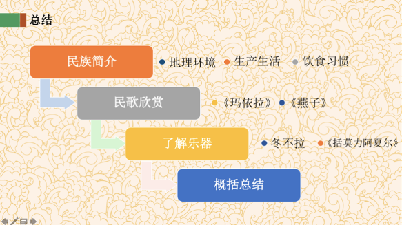最后进行课堂小结,巩固大家对哈萨克族民歌和乐器特点的掌握。