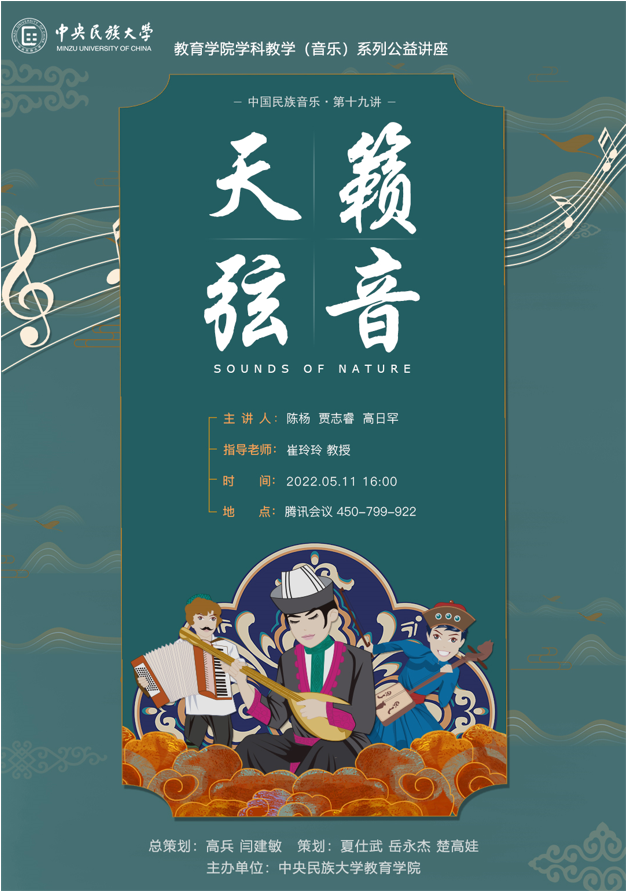 在教育学院学院领导和指导教师崔玲玲老师的带领下,学科教学(音乐)专业的硕士研究生们于2022年5月11日星期三下午16:00成功举办了“献给孩子们的民族音乐公益系列讲座”, 学生们讲授了哈萨克族、塔吉克族、蒙古族的民间音乐,在整体的教学中,教学导入生动有趣、在介绍民族音乐前,首先为听众介绍了该民族基本概况,在接下来的主体课堂内容的讲授中,每一部分内容的设计意图明确、重点突出、在增加课堂气氛中与教学重点中实施了师生互动环节,效果良好,讲座结束时,学生们均对自己讲座的内容做了精准的课堂小结。学生们通过线上的讲座,对中小学的音乐课教学的形式、内容、规范等系列知识有了进一步掌握。现将第十九期的讲学内容总结如下: