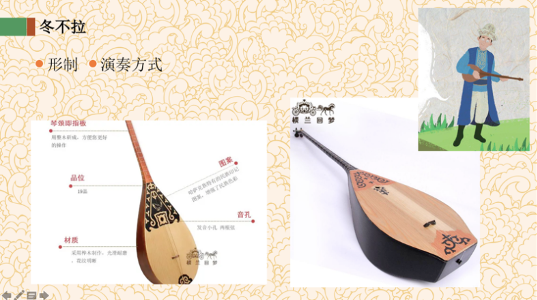 设计意图:哈萨克族能歌善舞,许多民歌的演唱都伴随着乐器的伴奏,因此,作为哈萨克族民歌赏析不能缺少对乐器知识的掌握。