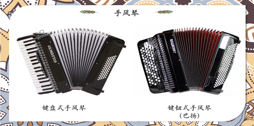 首先,了解键盘式手风琴和键钮式手风琴(巴扬)的最大区别在于琴键的排列方式和琴键数量两个方面的不同。之后,聆听由键钮式手风琴(巴扬)演奏的《丰收的节日》,使大家感受手风琴音色的同时,初步了解塔塔尔族的手风琴、曼托林这两种乐器后,欣赏由键钮式手风琴(巴扬)演奏的《丰收的节日》,感受手风琴的美妙音色。随后,简单了解塔塔尔族的另外一种乐器——曼托林。介绍曼陀林是属于拨奏弦鸣乐器;琴身为梨形;一般它有四组弦,每组两根,一共八根;在演奏时一般采用塑料拨片拨动琴弦发声,需快速反复弹奏,以保持音响持续。
