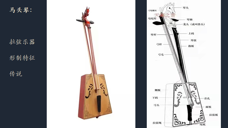 首先,提出三个问题分别是:马头琴属于什么乐器?马头琴长什么样子?马头琴的音色有什么特点?就这三个问题和大家一起思考并鉴赏马头琴独奏曲《鸿雁》。