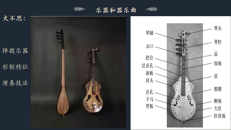 其次,通过图片对比的方式直观的给大家展示明代、清代记载的火不思和新中国成立后重建的火不思形制的区别,实物展示新型火不思琴头是弓箭,四根琴弦。用拨片或者手指弹奏,所以属于弹拨乐器,通常演奏者竖抱着乐器,用左手按弦,用右手的拇指和食指弹拨琴弦。现场演示火不思的演奏技法弹(向外拨弦)、挑(向内拨弦)、滾奏、扫弦、指拨等,总结火不思的音色特点:清晰、明亮,音色柔和优美,常用于独奏、合奏或为歌舞伴奏。介绍完火不思乐器类型、形质特征、演奏方式后鉴赏火不思乐曲《蒙古莫里》。