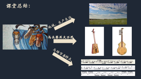 最后拓展:马头琴除独奏外常用于伴奏以及与四胡等乐器合奏,还可以给长调伴奏。通过播放马头琴和长调的视频让大家感受长调和马头琴像是姐妹一样,两者在表现技巧相互模仿,相互融合,两者声音非常接近。