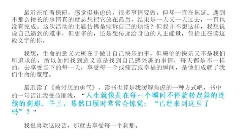 很开心通过这个活动和原来没有交集的同一个学校的陌生人有了联系!我把自己的小快乐和一些烦恼分享出去,也受到了其他同学的小确幸的感染,积极地去发现更多生活中的美好。作为一个高年级的学姐也可以给学弟学妹一些经验和见解,希望他们不会再踩我踩过的坑。很开心能吐露一些心声,也因为能帮到学弟学妹感觉到自己的价值。也许之后我们不会常联系,但是我们曾经是交换过烦恼的有缘人~