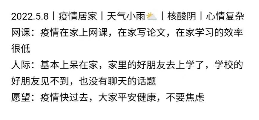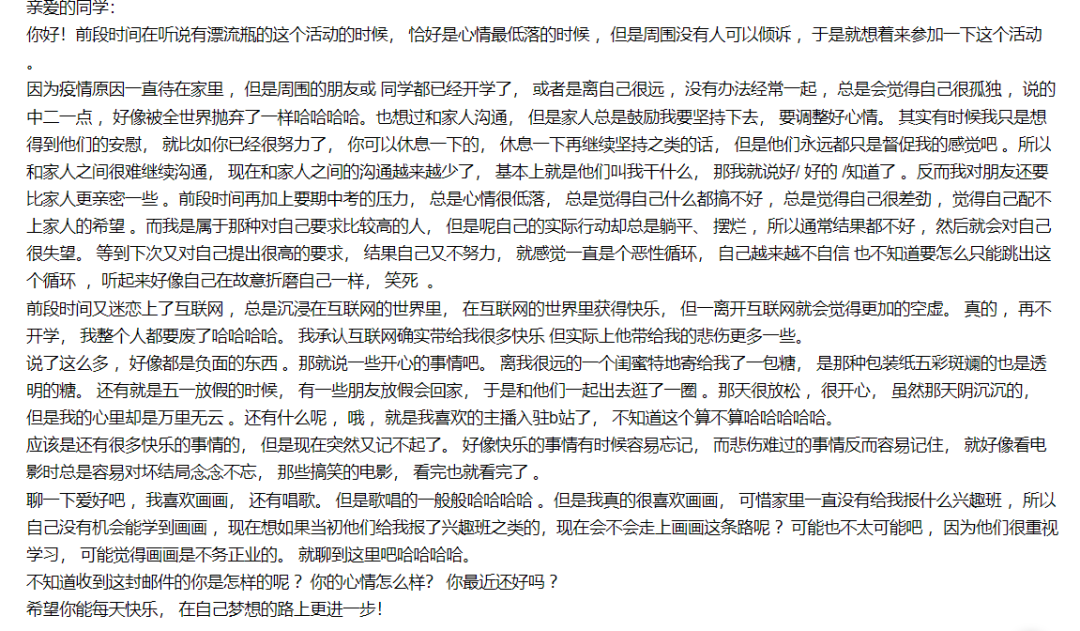 疫情期间大家在家好像都比较焦虑,但是没关系,我们都可以找到自己感兴趣的事情,好好去做,每天开开心心的,多锻炼,多看书。可以享受独处的空间,但也可以跟别人多多交流,总而言之,开心就好。感谢这次漂流瓶活动,让我们跟同龄人之间多了一次沟通的机会。
