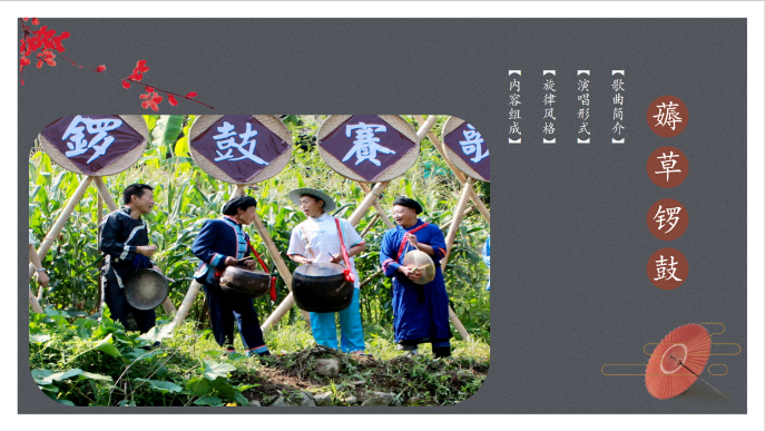 最后是薅草锣鼓。薅草锣鼓又被称为劳动歌,他是土家族人在田间劳作时所演唱的,有着缓解劳动疲劳,振奋精神的作用。他们唱这种歌曲的时候基本都是男子居多,而且在演唱时使用打击类乐器进行伴奏。通过观看图片、欣赏音频的方式,来了解薅草锣鼓的风格、演奏形式等特点。