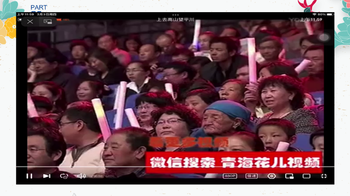 这首作品是回族最具代表性的民歌类型“花儿”。“花儿”是属于山歌类的,这种高腔山歌是回族最具代表性的民歌,由于“花儿”长期传播于高原、山川之间,因此在整体上形成了高亢、奔放、粗犷的音乐风格。它的曲调悠长,音域宽广,节奏自由,多用真假声相结合的唱法进行演唱。《上去高山望平川》是回族“花儿”中最为典型的一首歌曲。“花儿”歌词中常习惯在句中和句尾加“啊、吧、者、呀”等虚词或“哎嘿呦”等语气词。歌词采用方言演唱,具有浓厚的地方特色。通过视频的播放、学生的思考以及我的讲解来让大家了解回族中最具有代表性的民歌特征。
