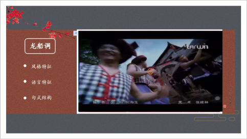 首先是龙船调。龙船调的曲调来自利川地区的花灯歌《种瓜调》,是土家族人民为了烘托节日气氛的歌舞音乐,在歌曲中增加了一段妹娃与艄公的问答,使得歌曲风格变得活泼有趣。在介绍龙船调时主要分为歌曲风格特点、语言特征和句式结构三个方面。