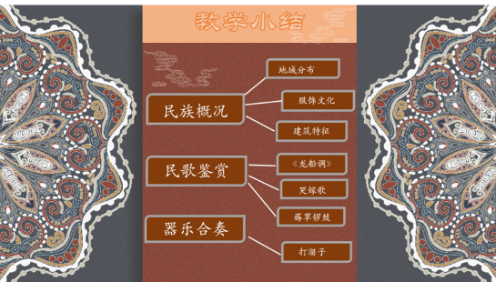课堂的最后,我通过思维导图对本次讲座的内容进行了回顾总结,以此来巩固大家对维吾尔族人文文化和音乐文化的了解。