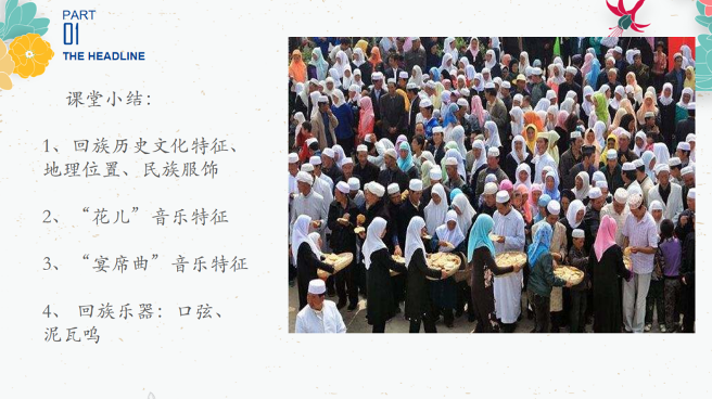 设计意图:通过一些精美图片来展示回族的地理位置、历史起源、宗教信仰以及服饰特征等,让学生对回族的大致情况做一个简单了解,为后面民族音乐特征的讲解做铺垫。