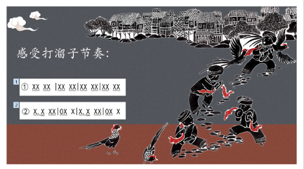 设计意图:通过一个节奏互动,让大家都能参与到活动中来,并通过自己动手拍击节奏,更加切身的体会到打溜子乐曲的特点。