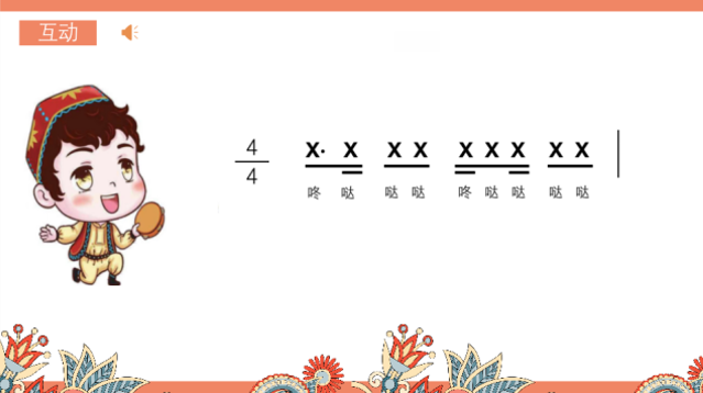 设计意图:通过节奏互动,熟悉切分节奏型和附点节奏型,更深刻的体会维吾尔族新民歌的节奏特点。