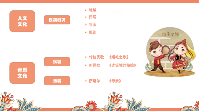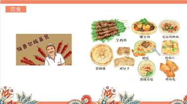设计意图:通过向同学们介绍维吾尔族的地域、住宅、饮食、服饰等人文文化,更加深刻的了解我国少数民族文化,培养学生铸牢中华民族共同体意识。
