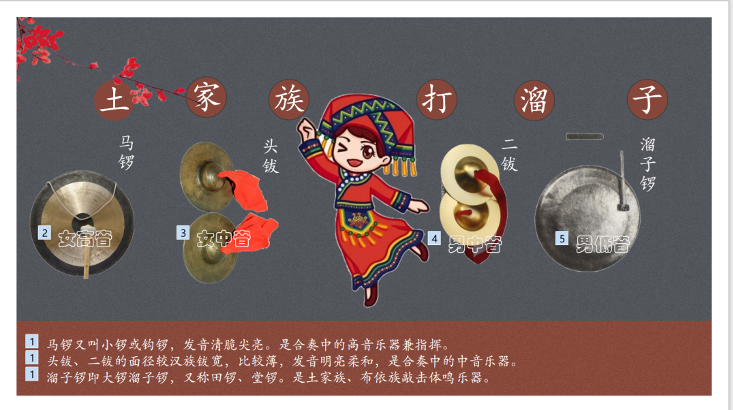 设计意图:以土家族最有代表性的打溜子为介绍对象,通过展示不同打击类乐器,欣赏打溜子乐曲《锦鸡出山》,增加对打溜子的认识。
