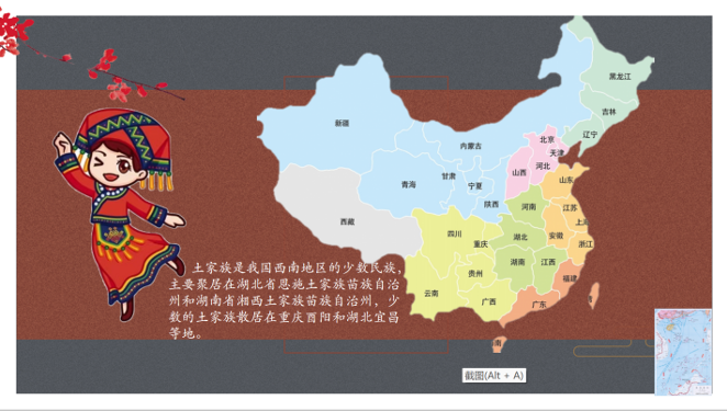 内容包括:土家族人口分布、生活环境特点、传统建筑特点、男女民族服饰特色等。土家族是居住在我国中南、西南地区的少数民族,主要聚居在湖北省恩施土家族苗族自治州和湖南省湘西土家族苗族自治州,少数的土家族散居在重庆酉阳和湖北宜昌等地。传统建筑是吊脚楼,主要搭建在后有高山,前有溪水的地方。男女分别都带有头巾,穿着简朴,男生的衣服是琵琶襟,女生的是左襟,衣服风格较为宽松。