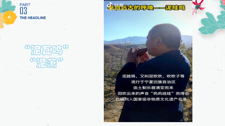 第二个乐器是泥瓦呜:泥瓦呜(又称泥萧),是我国古代土制乐器,是用黄胶泥捏而成,“泥瓦呜”是回族牧童放牧时喜欢吹奏的乐器,它的音色古朴深邃,泥瓦呜除演奏一些常见的民歌小调外,还可以吹奏具有-风味很浓的曲调。