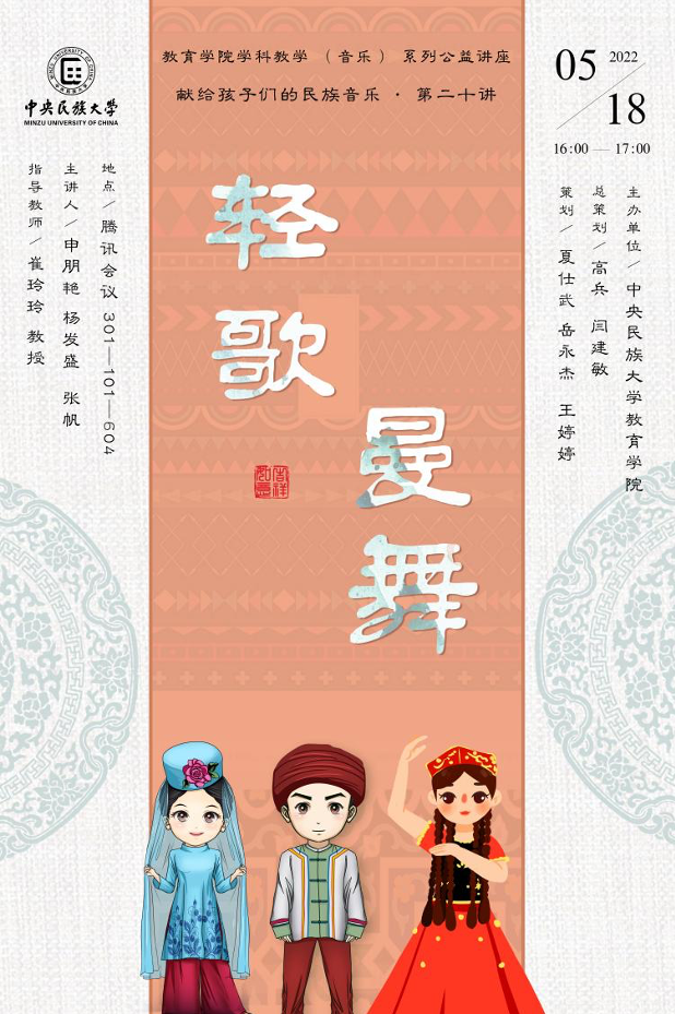 在教育学院学院领导和指导教师崔玲玲老师的带领下,学科教学(音乐)专业的硕士研究生们于2022年5月18日星期三下午16:00成功举办了“献给孩子们的民族音乐公益系列讲座”, 学生们讲授了维吾尔族、土家族、回族的民间音乐。在整体的教学中,教学导入生动有趣,在介绍民族音乐前,首先为听众介绍了该民族基本概况,在接下来的主体课堂内容的讲授中,每一部分内容的设计意图明确、重点突出、在增加课堂气氛中与教学重点中实施了师生互动环节,效果良好。讲座结束时,学生们均对自己讲座的内容做了精准的课堂小结。学生们通过线上的讲座,对中小学的音乐课教学的形式、内容、规范等系列知识有了进一步掌握。现将第二十期的讲学内容总结如下: