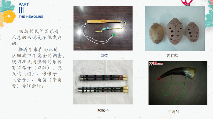 设计意图:虽然说回族的民族器乐并不是特别发达,但仍然存在一些十分有特色且有趣的器乐类型,因此将回族的民族器乐介绍给大家也是不可或缺的一部分,通过图片展示、视频播放的形式使大家加深对回族器乐的了解。