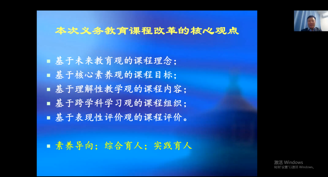 然后,张华教授生动介绍了我国课程改革的发展历史。从2001年第一次课程改革到2022年义务教育课程标准的颁布,课程改革从价值论阶段逐步进入了认识论阶段,从强调“为了每一个学生的发展”再到强调“让学生创造着长大”。在解读《义务教育课程标准(2022版)》基础之上,张华教授高度概括了最新义务教育课程改革的核心观点,即“基于未来教育观的课程理念”“基于核心素养观的课程目标”“基于理解性教学观的课程内容”“基于跨学科学习观的课程组织”“基于表现性评价观的课程评价”。在未来教育观的课程理念的解读中,张华教授用具体的实例讲解了未来教育的定义以及未来教育观中所体现的课程体念,并提出我们教育者在面向未来中应该怎么做,引发师生的思考。在核心素养观的课程目标解读中,张华教授结合当前的时代背景讲解了提出核心素养的原因以及什么是“核心素养观”。在理解性教学观的课程内容解读中,张华教授结合当前国内的研究现状,讲解了“理解性教学观”定义,强调了“理解”的重要性。最后张华教授讲解了“跨学科学习观”的定义及种类,新课程怎样走向“跨学科学习”,强调了“表现性评价”的重要性。