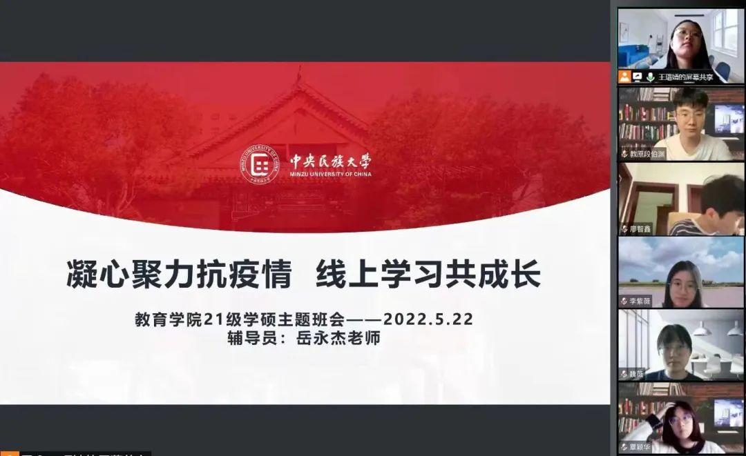 为了交流近期生活及学习情况,缓解同学们的学业压力,教育学院2021级学硕班于5月22日召开主题为“凝心聚力抗疫情,线上学习共成长”线上班会。辅导员岳永杰老师莅临指导,班长王瑨婧主持。学硕班27名同学全员到齐,共同学习交流。