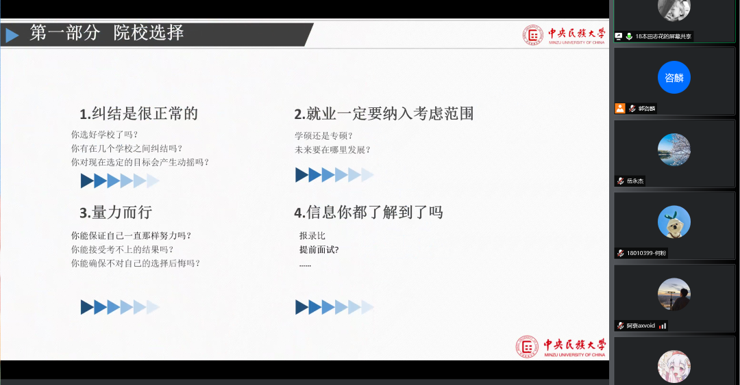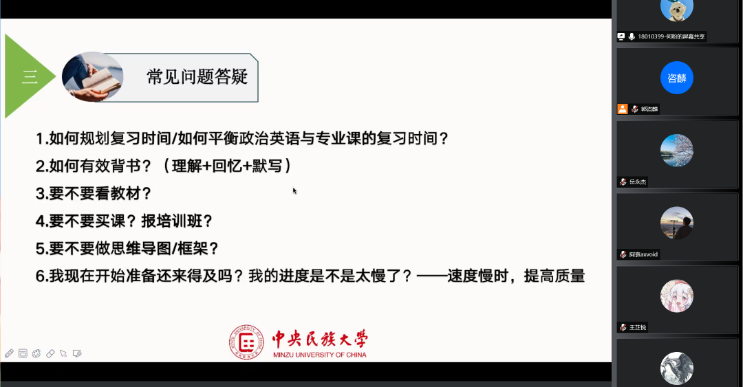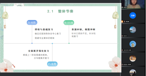 田志花从院校选择、备考经验、考研心态、避坑指南四部分展开经验交流。她强调备考时一定要多次重复记忆、确定合适的复习工具(自己做框架、抄书、软件上记)、注意主观投入的重要性和答题时间的把握。最后田志花对提前面试的含义、条件要求做了相应解答。