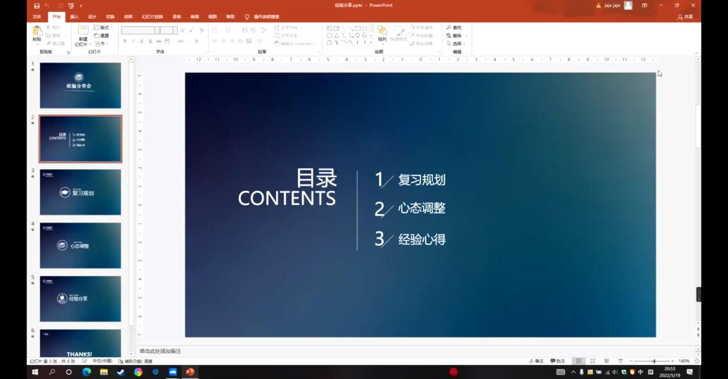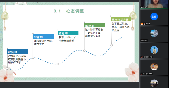 王芷悦从个人介绍、备考过程、考试、总结四个部分展开经验分享。在整个分享过程中,王芷悦以自身经历现身说法分享自己在考研过程中每一个节点的状态、心得,最后为同学们总结出三点经验:做好并完成计划、可以适当摆烂但永不言弃、随机应变。同时,王芷悦提醒考研同学要在学习备考过程中注意“整体(章)+细节(知识点)+联系+实际”,有条不紊地完成备考任务。