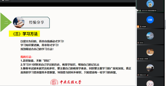 何粉从时间线、各科目复习规划、学习方法、心态四方面展开经验分享。关于学习方法,何粉指出考研要以提分为目的,而非自我感动式学习。学习知识要进脑,而非形式化学习,一定要找到最适合自己的学习方法。同时何粉也介绍了自己在考研中的三点方法:一是及时复盘,不断“回忆”;二是学习311时联系所学历史、教育学知识,增加记忆点;三是要注重自己的教育学素养、学习的广度深度、质量和效益。最后,何粉针对同学们考研过程中常遇到的困惑做了解答。